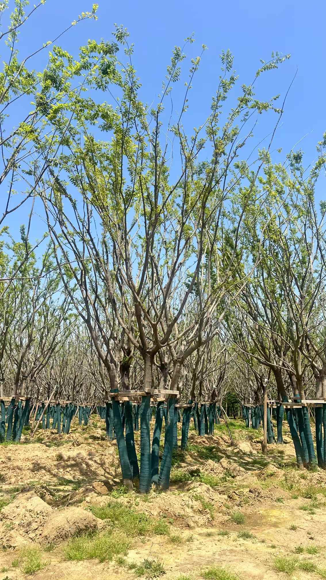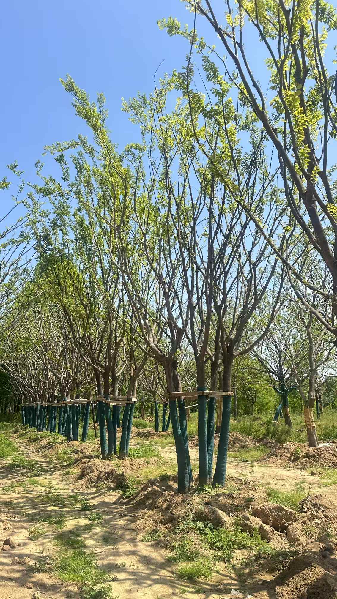 挖掘叢生樸樹 5-7米時,根系完整性是成活的關(guān)鍵,叢生樸樹屬于深根性的樹種,它的須根少、主根發(fā)達(dá),因此需要優(yōu)先選擇生長在水源附近的植株,這類環(huán)境下的樸樁須根較多。起苗前可通過搖晃主干判斷根系狀況,如果晃動穩(wěn)健,就說明四周有明顯牽阻力,它的須根發(fā)達(dá),如果反之成活率就低了。挖掘后修剪與消毒也很重要,剪除殘枝及過長主根,側(cè)根可用布條回拉塑形。根系用0.5%高錳酸鉀溶液浸泡10分鐘消毒,創(chuàng)口涂500ppm吲哚丁酸促進(jìn)生根處理。..